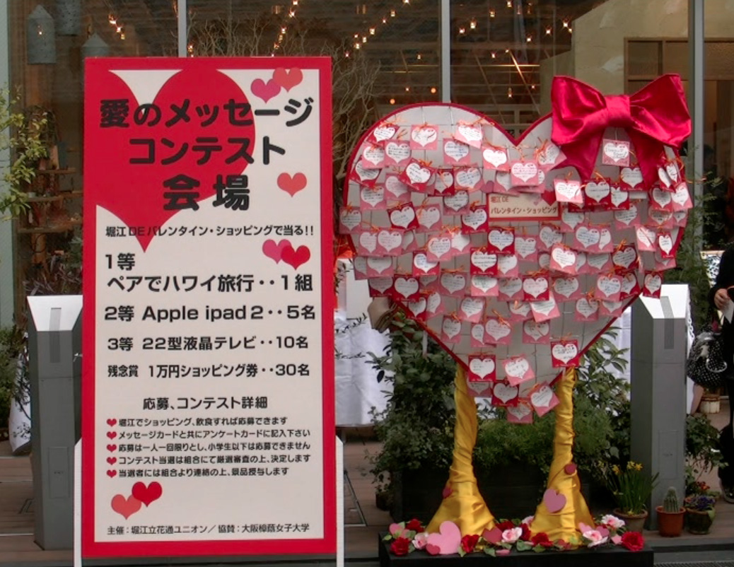 2月10日〜11日に開催されました。堀江 DE バレンタイン・ショッピング。愛のメッセージコンテスト400を超えるメッセージが集まりました。堀江でバレンタインのお買い物をした人達が彼氏に愛のメッセージをカードに書いて、バレンタイントゥリーに吊りました。