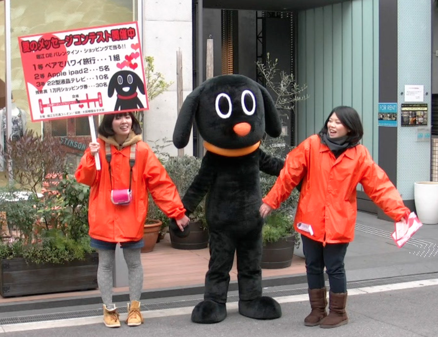堀江 DE バレンタイン・ショッピングでは堀江のキャラクターHollyちゃんもお手伝い。大阪樟蔭女子大学の生徒さんとのコラボレーションです。