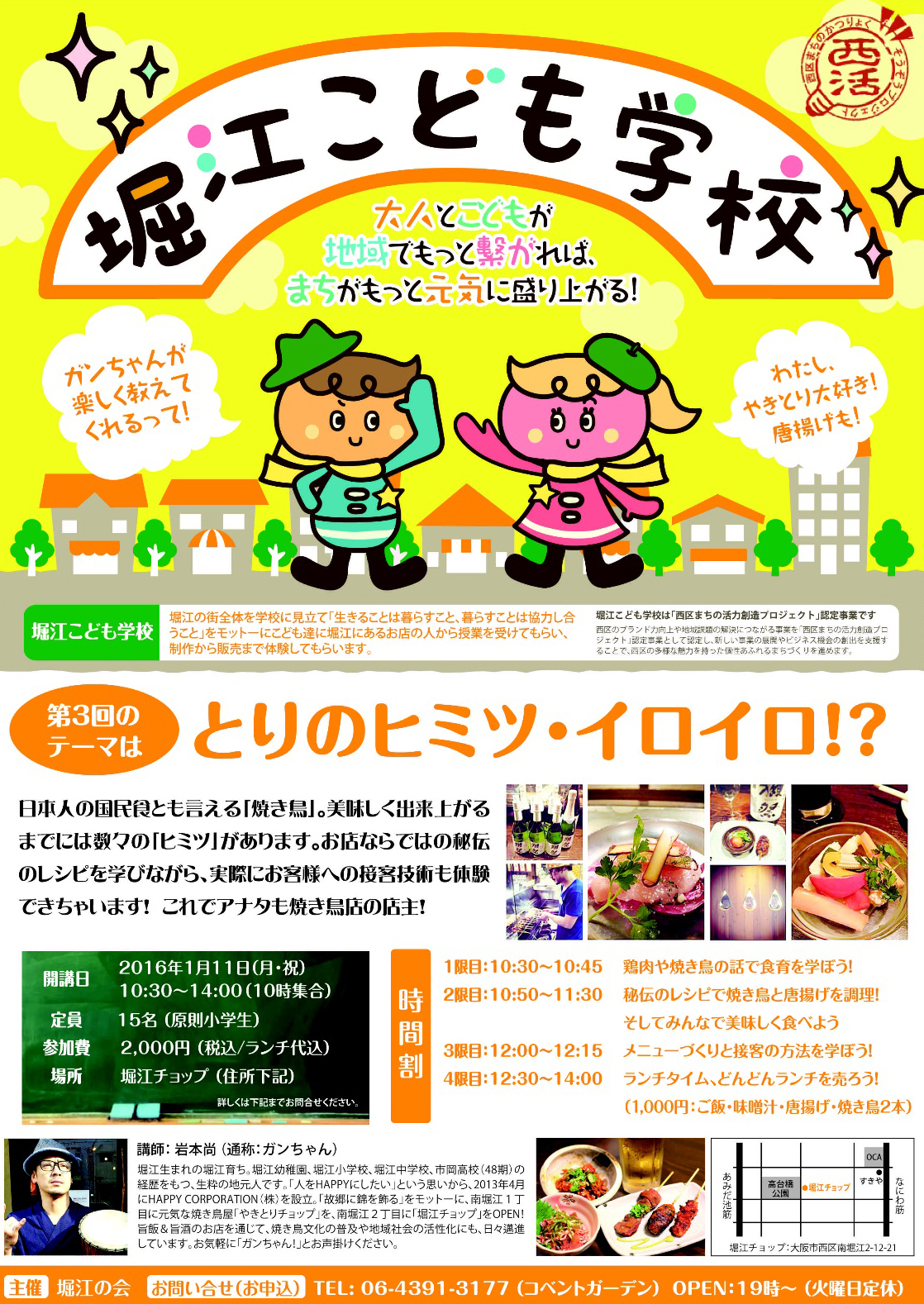 堀江の街全体を学校に見立てて「生きることは暮らすこと。暮らすことは協力し合うこと」をモットーにこども達に堀江にあるお店の人から授業を受けてもらい、制作から接客や販売を体験してもらいます。第3回もテーマはとりのヒミツ・イロイイロ!?と題して「ほりえチョップ」のガンちゃんが楽しく教えてくれます。