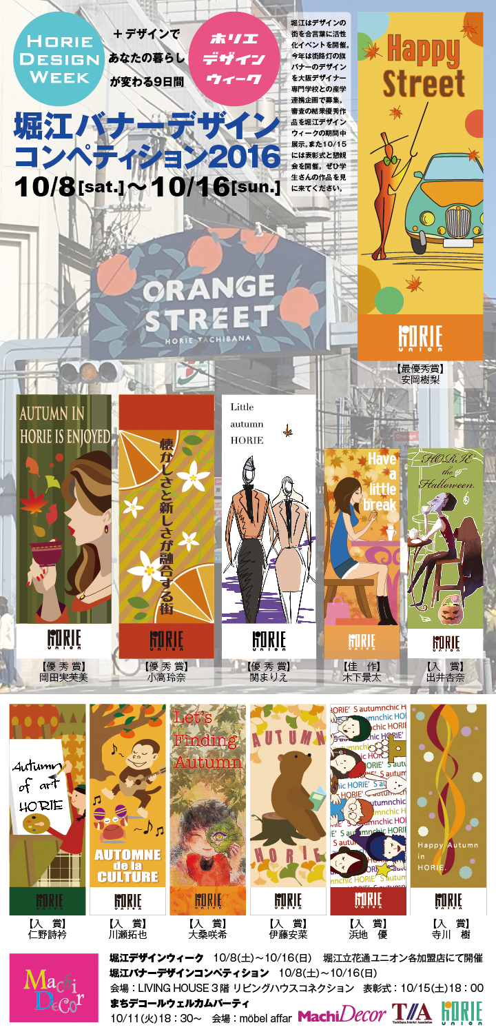堀江はデザインの街を合言葉に活性化イベントを開催。今年は街路灯の旗バナーのデザインを大阪デザイナー専門学校との産学連携企画で募集。審査の結果優秀作品を堀江デザインウィークの期間中展示。また10/15には表彰式と懇親会を開催。ぜひ学生さんの作品を見に来てください。