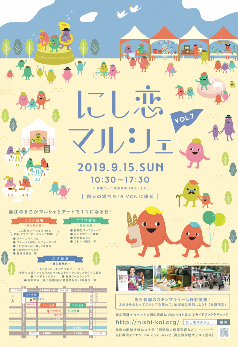 また、9/1→9/15の期間は、関西スーパーマーケット南堀江店、LIFE西大橋店で「にし恋シールキャンペーン」も実施。1,000円お買い上げ毎にもらえるシールを5つ集めて、当日の「ミライ会場」の抽選会に参加しよう!
